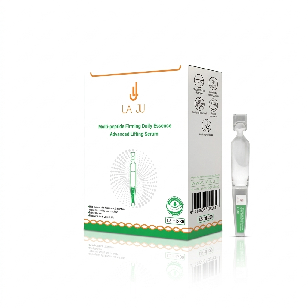 LAJU Multi-peptide Firming Daily Essence. This advanced formula combines a botanical complex with cutting-edge science, featuring Boseine and multi-hyaluronic acid. It is specifically designed to deeply hydrate, refine skin texture, and replenish essential nutrients, leaving your skin remarkably smooth and radiantly glowing.